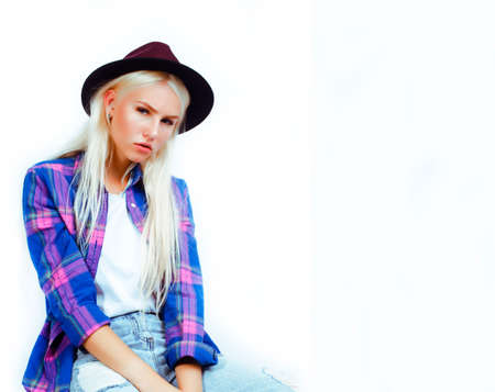 young pretty stylish blond hipster girl in hat posing emotional isolated on white background, lifestyle people concept