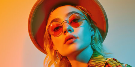 Stylish woman in red outfit, hat, sunglasses, colorful background