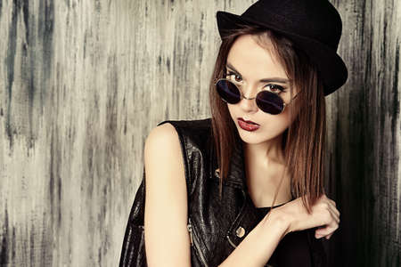 Asian girl in sunglasses and black leather jacket posing against dark blue background