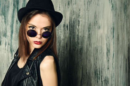 Attractive fashionable young woman wearing in hat and glasses. Optics style. Studio shot.