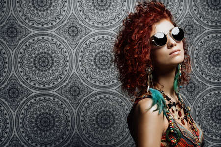 Close-up portrait of a beautiful bright woman with curly foxy hair in sunglasses, earrings and beads. Ethnic style in accessories.