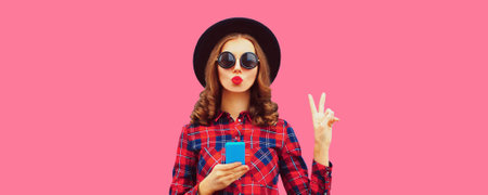Portrait of young woman blowing her lips with phone wearing black hat and red shirt on blue background