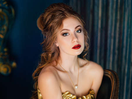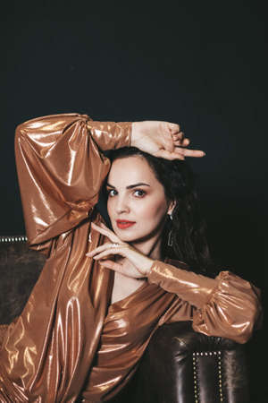 Beautiful sexy girl with sensual lips, fashion hair, gold dress and accessories. Beauty face. Picture taken in the studio