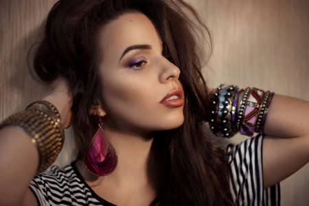 Sexy girl with clean perfect skin. Stylish accessories. Fashion wear. Healthy hair. Fashionable jewelry. Earrings. Beautiful model girl. Beauty, makeup, cosmetics. Spa, skincare, wellness. Copy space