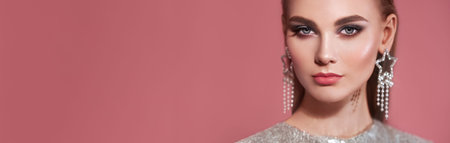 woman in a silver dress beautiful hairstyle bright makeup pink background