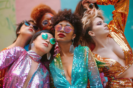 Diverse group of women wearing shiny clothes and sunglasses, A group of diverse women dressed in sparkling outfits, ready to hit the town