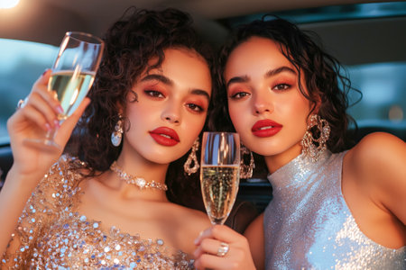 Glamorous Young Women Toasting with Champagne in Luxury Car