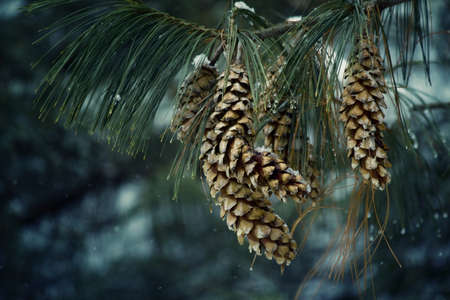 Close up view of pine branch with cones.