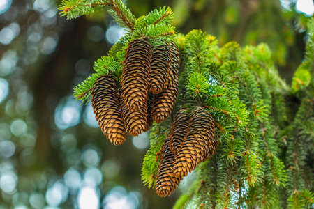 Spruce tree branches with many cones closeup, fir tree background