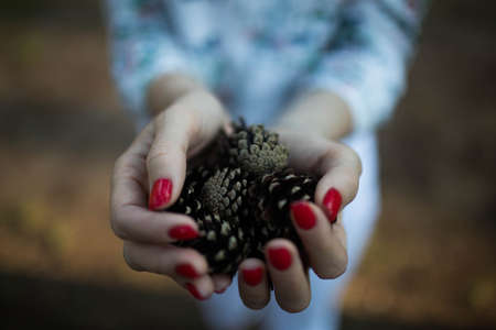 small cones in the palm of the hand. autumn time. gifts of the forest.