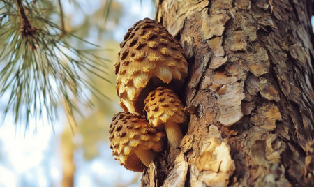 Cluster of pine-cone-like mushrooms growing on a tree trunk in a serene forest setting