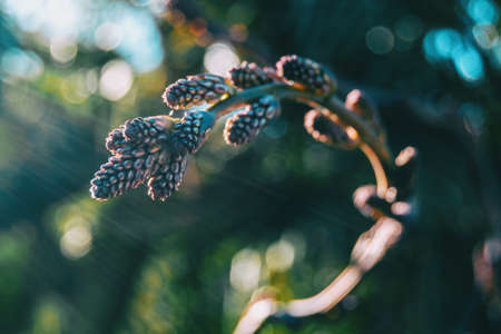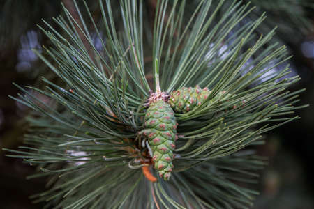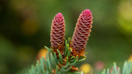Small unripe spruce cones on a tree, macro photography, background