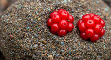 Nutty trail mix with dried cranberries scattered on a rustic surface in a natural setting