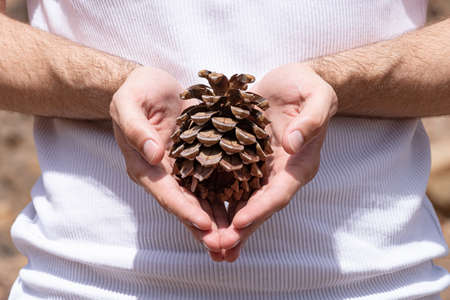 Pine cone in the hands. Natural wallpaper. Nature in the hands