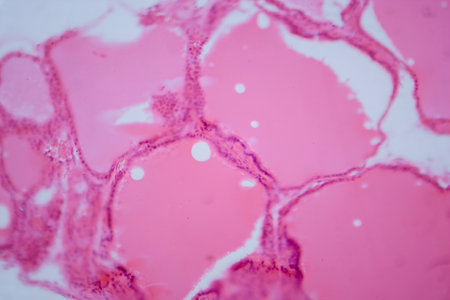 Photomicrograph of a normal thyroid gland under a microscope, exhibiting typical follicular structure and colloid-filled follicles.