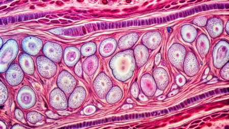 This detailed microscopic image showcases various cellular structures, highlighted in striking purple tones. The intricate patterns and textures reveal the complexity of biological tissues, making it a valuable resource for educational and scientific purposes