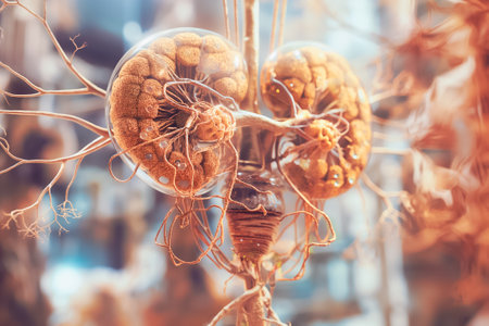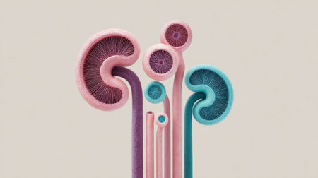 A close-up of the human kidney with visible structures such as nephrons and blood vessels, set on a neutral background with a focus on details