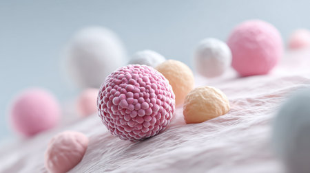 This image showcases a detailed close-up view of colorful microorganisms, highlighting their unique structures and textures in a laboratory environment focused on biological research.