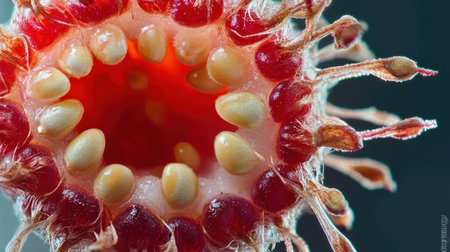 A close up of a plant organ with blue and red colors. The organ is surrounded by a white background
