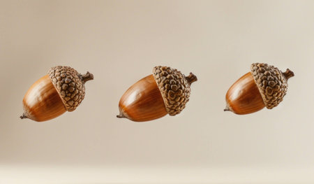 Collection of three decorative acorns in various positions against a neutral background, showcasing natural textures and organic shapes.