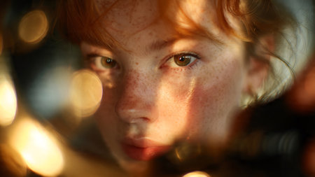 Close-up of a young woman with freckles and curly hair, illuminated by striped sunlight