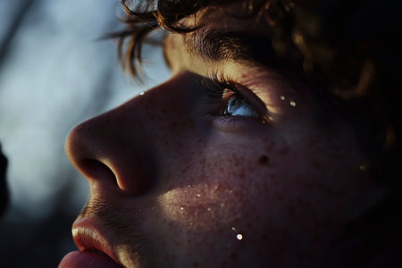 Close-up of a person's face, looking up, sunlight illuminating freckles and skin.