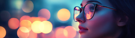 Woman with glasses, softly lit, in a night city scene with bokeh lights