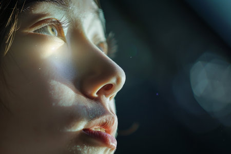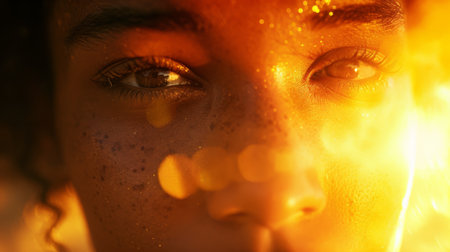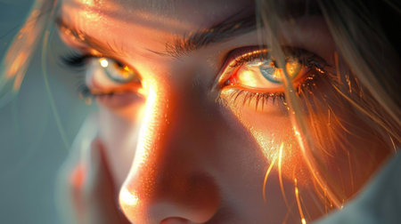 Macro portrait of female face with glowing orange light patterns symbolizing digital interface, data processing, and biometric scanning