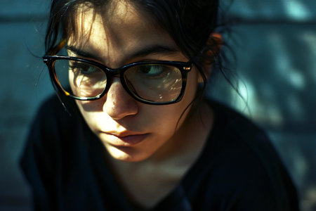 Intense gaze of a woman with curly hair and stylish eyewear, illuminated by warm sunlight