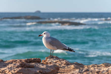 Detailed close-up of a seagull with vibrant red beak and focused gaze, set against a soft ocean backdrop, highlighting the essence of avian life and natural beauty