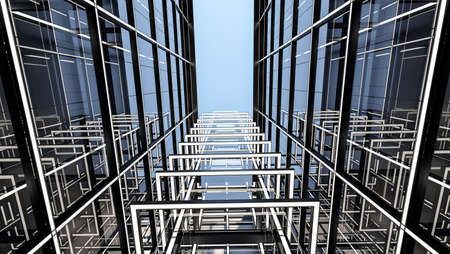underside panoramic and perspective view to steel blue glass high rise building skyscrapers, business concept of successful industrial architecture