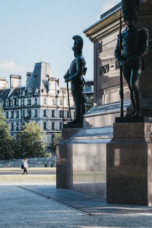 London, UK - July 15, 2019: Close up of equestrian statue of the Duke of Wellington, London, people walk on background. The statue was executed by the sculptor Joseph Boehm and unveiled in 1888.
