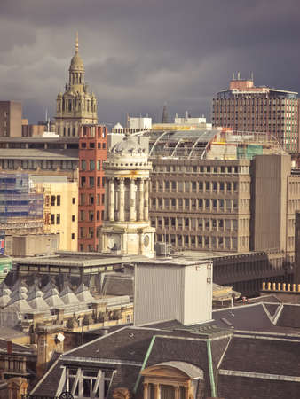 A wide panoramic looking out over old and new buildings and streets in Glasgow city centre. Scotland, United Kingdom