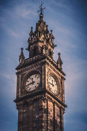 BELFAST, NORTHERN IRELAND, DECEMBER 19, 2018: Close up of Albert Memorial Clock Tower situated at Queen's Square in Belfast. It was completed in 1869 and is one of the best known landmarks of Belfast