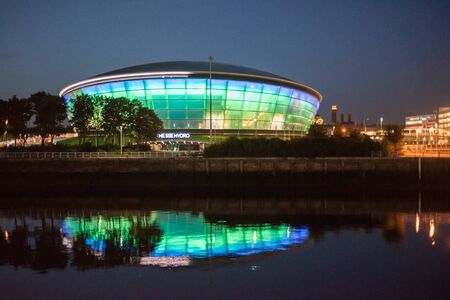 Glasgow/Scotland - September 20 2016: The SSE Hydro lit up in blue and green and reflected in the Clyde River at night