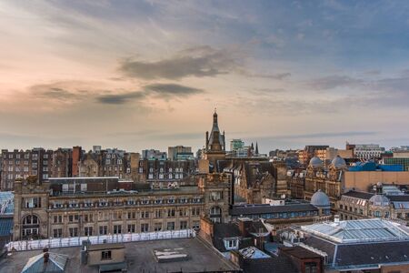 A wide rooftop view looking out over the buildings and architecture of Glasgow city centre at sunset, Scotland