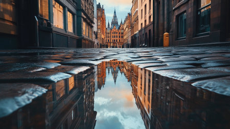 A tranquil urban scene showcasing the reflection of towering skyscrapers on a cobblestone street at dusk, evoking a serene atmosphere.