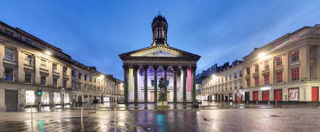 Gallery of Modern Art in Royal Exchange Square in the heart of Glasgow city centre in twilight , Scotland, panorama
