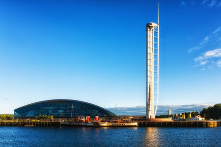 Glasgow Science Centre Tower and downtown lit by the setting sun. Clyde river embankment in evening. Famous touristic place in Scotland. Glasgow, Scotland