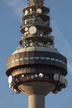 Madrid, Spain - May 19, 2020: Close-up detail of the Torrespa? ? a digital television and radio tower at sunset, with its swarm of satellite dishes.