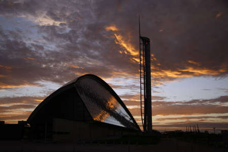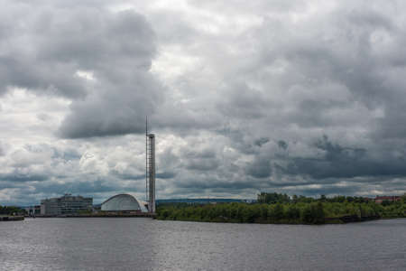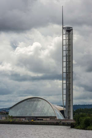 Glasgow, Scotland, UK - June 17, 2012: Glasgow science center and Glasgow Tower at Canting Basin on River Clyde under heavy cloudscape with wider view of back country.