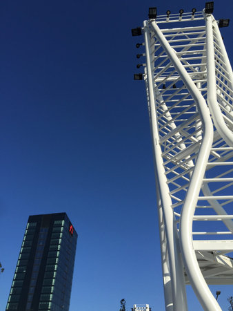 TOKYO, JAPAN - August 24 2018: Pillar of the Teleport Bridge that connects Daiba area and the Aomi area to such major attractions as Odaiba Seaside Park, Tokyo Beach Decks, Palette Town, Odaiba Seaside Park Station and Rinkai Line Tokyo Teleport Station.