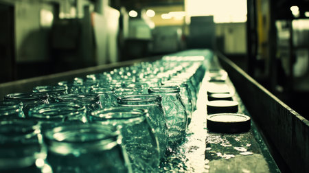 Vibrant imagery capturing an industrial production line in a factory where glass jars travel along a conveyor, highlighting craftsmanship and manufacturing processes.