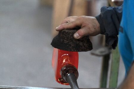 glass master while working in Murano furnace glass factory Venice Italy close up detail