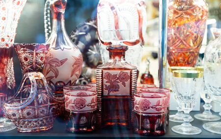Variety of elegant crystal clear glassware standing on illuminated shelves in modern glassware store