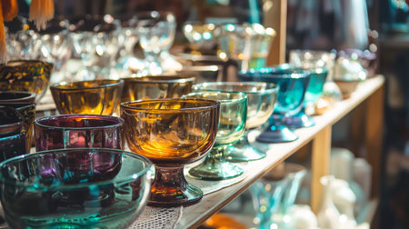 A vibrant selection of colorful glassware on display, illuminated by soft bokeh lighting. Ideal for themes of decor, home goods, and vintage collectibles.