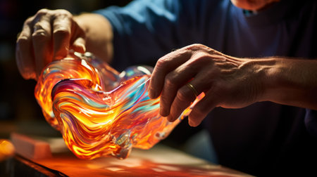 Close-up of hands shaping intricate glass sculpture colors illuminated by light