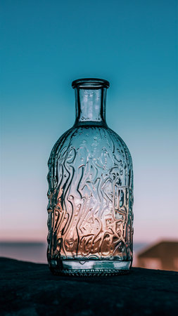 An elegant empty carafe, on a textured wooden table. Decanter in dark style