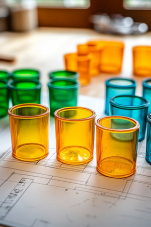 Colorful Transparent Cylinders Arranged on Blueprints. Design, Architecture, or Engineering Concept