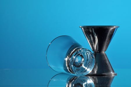 Bartender's Jigger and Shot Glass on blue